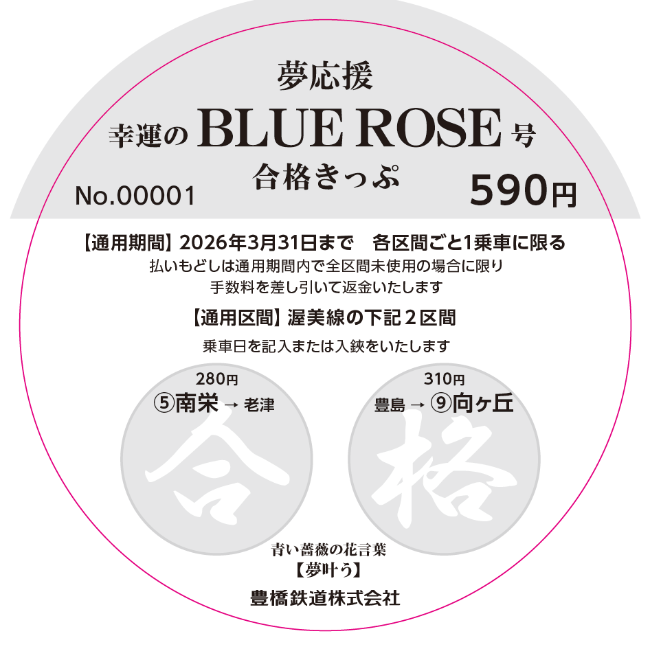 - 内容:5(ごう)・か・9(く)で合格の語呂合わせ。南栄駅(⑤)と向ヶ丘駅(⑨)を組み合わせた丸形乗車券です。