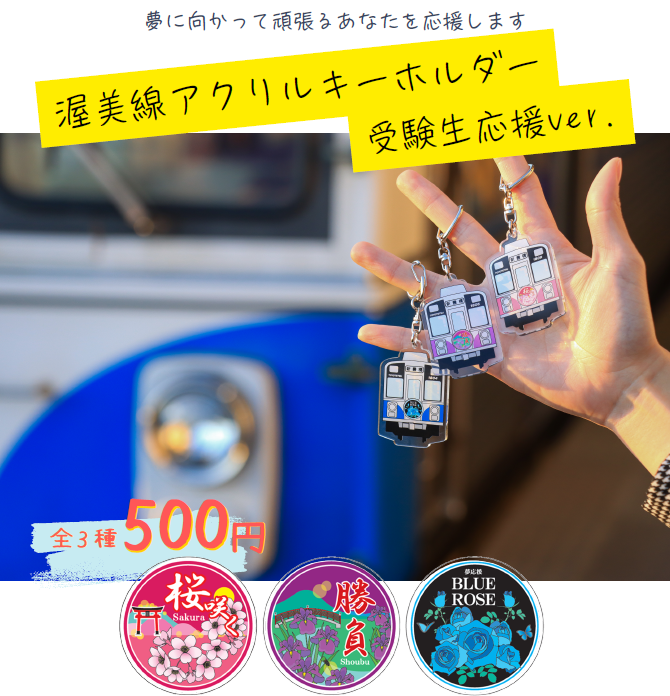 - 内容:「夢応援・幸運のBLUE ROSE号」に加えて渥美線「1805号(菖蒲)」を勝負、「1809号(桜)」を桜咲くに見立て、ヘッドマークを受験生応援デザインにアレンジしたアクリルキーホルダーです。
