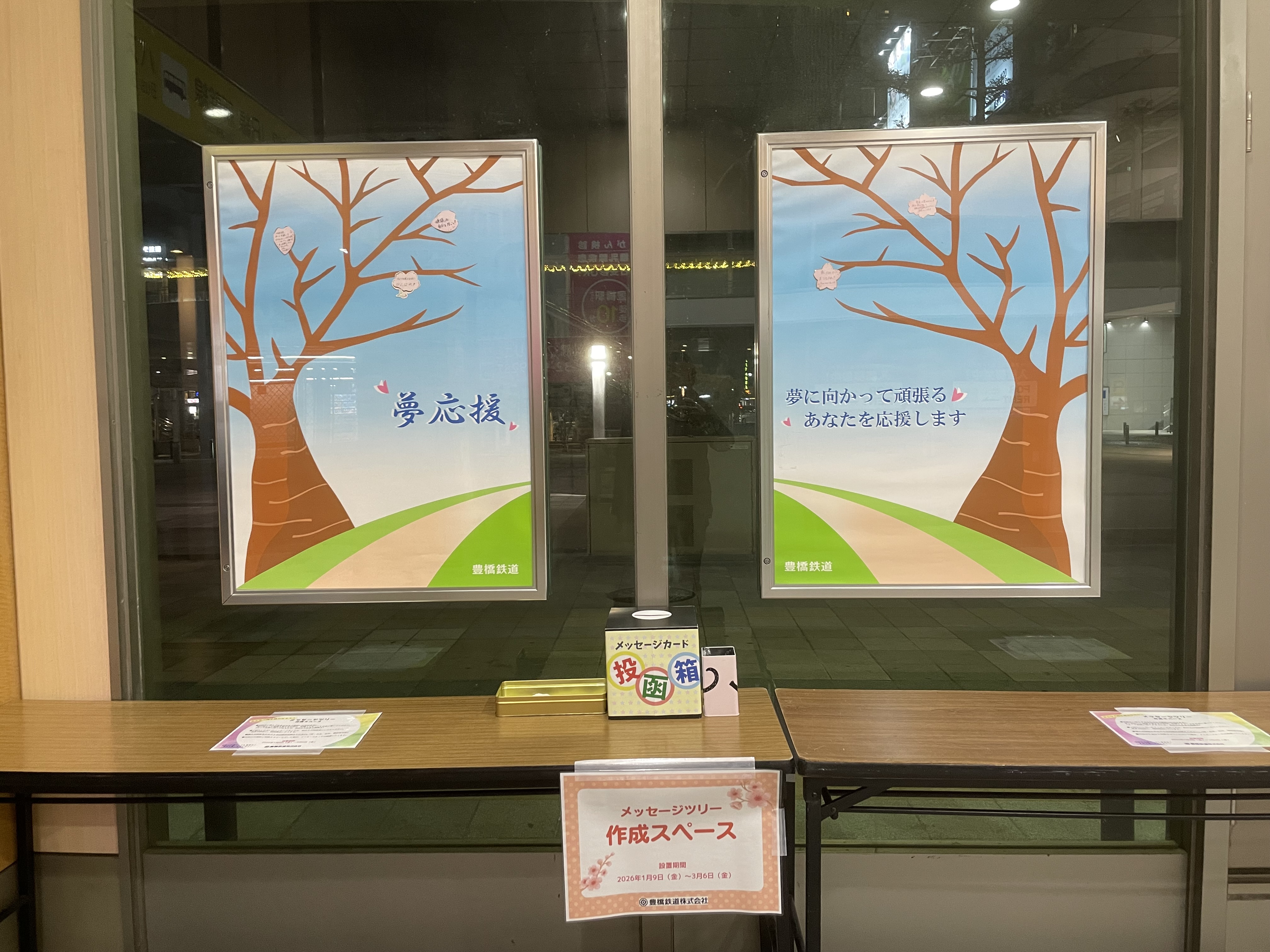 また、「夢応援・合格きっぷ」や「渥美線アクリルキーホルダー 受験生応援ver.」を発売し、購入者には東田本線(市内線)で車輪の空転防止に実際に使用している「すべり止めの砂」をプレゼントします。その他、桜型のメッセージカードに夢や願いを記入できる「メッセージツリースペース」を新豊橋駅に設置するなど、さまざまな応援企画をご用意しました。